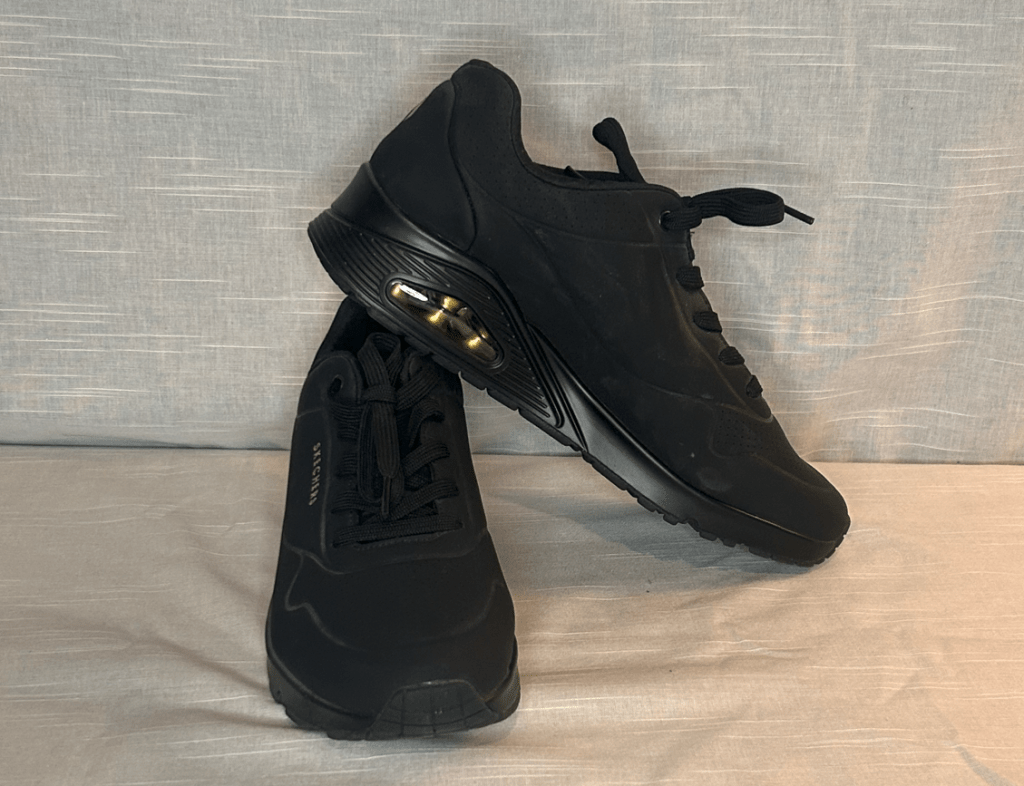 Sleek black Skechers with cushioned sole for comfort and support. Great for work, walking, or everyday wear. Only worn inside once. Just didn’t like the fit.